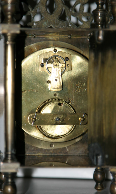 Strapped bell over 4 finials and Doric columns with ball feet, Roman chapter ring and engraved centre. High quality French spring-driven movement of 8 days duration.