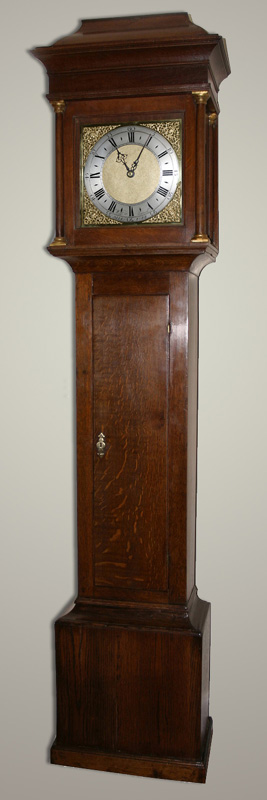 A George II oak longcase with 11" square brass dial and 30-hour birdcage movement. Fine matting to dial centre and fine steel hands.