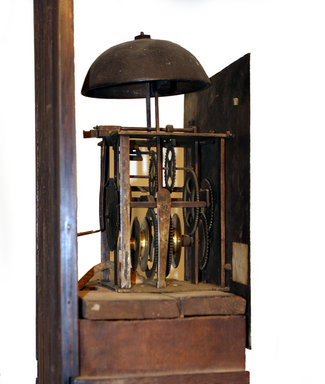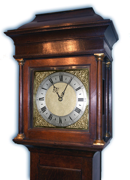 The oak case stands 82.5" high with caddy top. The hood having attached turned columns with wooden capitals to the front and quarter columns to the rear.