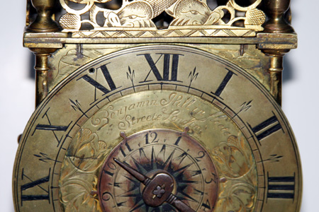 The dial plate with early tulip engraving and carrying the maker's signature 'Benjamin Hill in Fleete Streete Londini'. Single pierced iron hand. The narrow, silvered chapter ring with Roman numerals and inner quarter hour track with wheatear half hour markers enclosing the centre with silvered Arabic alarm setting dial with starburst engraving.