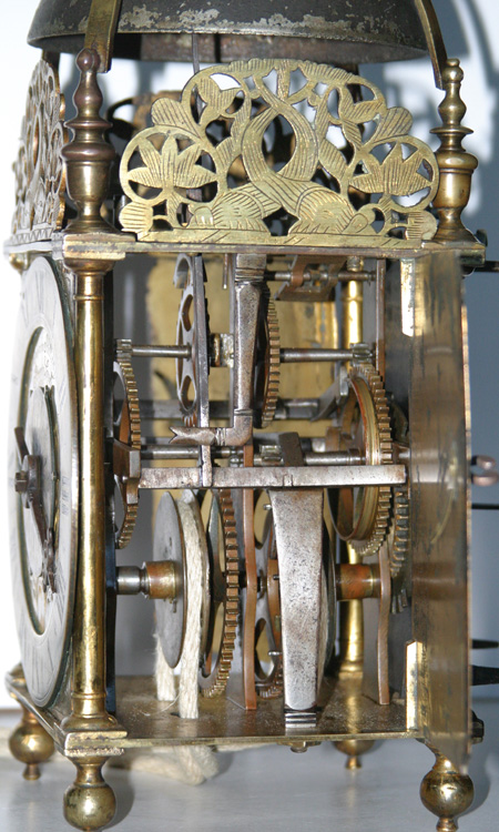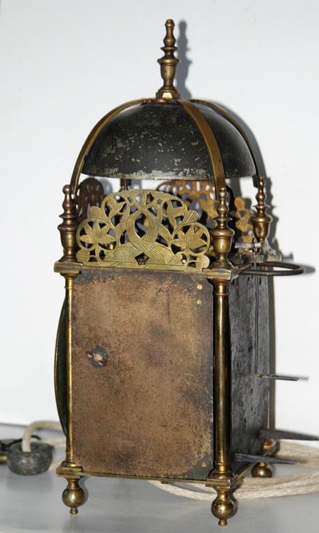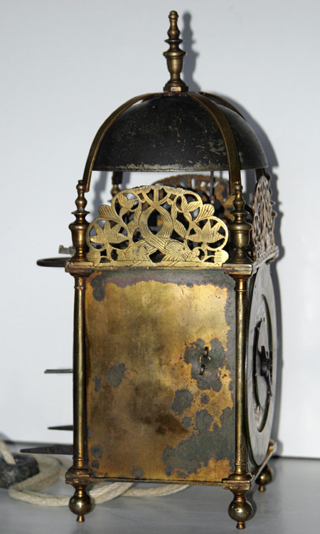 The clock is of standard lantern clock proportions, standing 15" high to top of bell finial with 5 3/4" square frame and 6 1/4" high engraved dial plate.