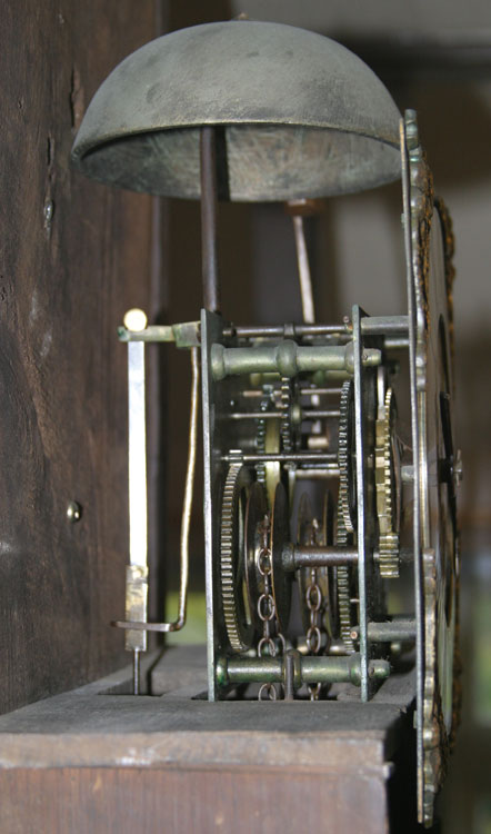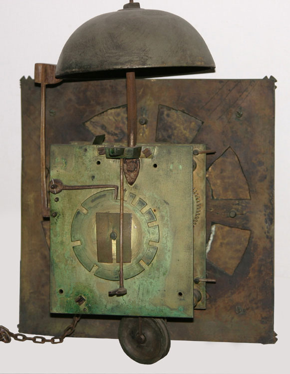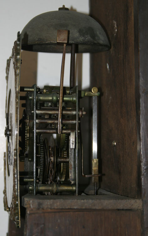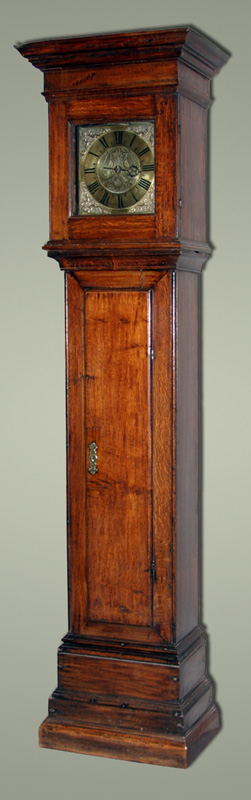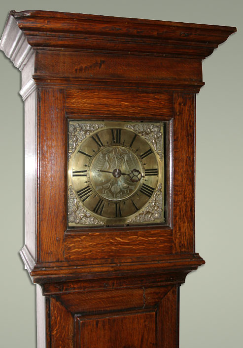 A George I oak longcase clock with 9 1/4" square brass dial and 30-hour plated movement. Dial corners having C&W no. 8 spandrels. The dial having engraved centre, the design comprising four naive birds within loosely engraved foliage. The chapter ring having inward pointing single arrowheads. The naive quality of the engraving suggests this may be the work of the clockmaker himself and the lack of signature due to limited engraving skills or the inability to read and write. The style and period of the clock indicate that the clockmaker may well have been a quaker.