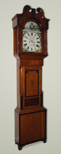 An oak longcase with 8-day painted break-arch dial 14" x 20". Light oak case with mahogany and rosewood crossbanding and inlay, standing 91.5" high. Swan-neck pediment to the hood, turned mahogany pillars and period glass. The dial has brass hands showing hours minutes and seconds. The clock is totally original and in good working condition. Both case and dial have been sypathetically restored.
