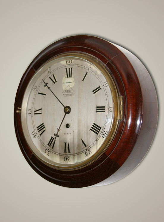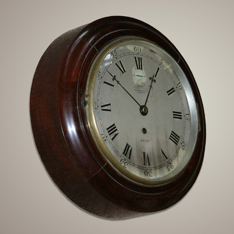 A wall clock by Dent of London in a mahogany case. Having 8" silvered dial carrying maker's name, "Dent, 28 Cockspur St, London" and numbered 62333, surrounded by an 8" cast brass bezel with convex glass. Spring-driven movement, 10-day duration with platform escapement. Dial silvering shows signs of age and may benefit from being re-silvered (can be carried out at buyer's request).