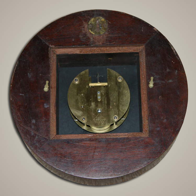 11" overall clock case diameter, 4" overall depth of clock, 8" diameter silvered dial.