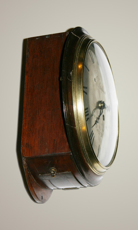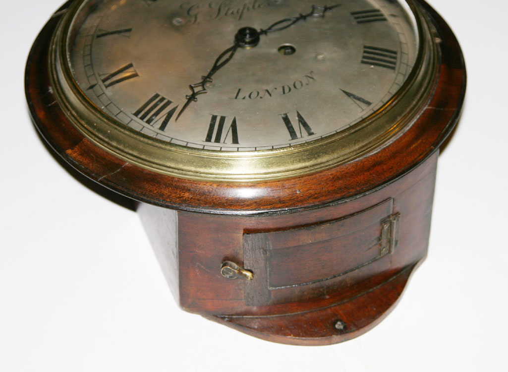 An 8-day wall clock by George Staples of London in a mahogany case. Having 8" silvered dial engraved with maker's name, G Staples London, and surrounded by an 8" cast brass bezel. The fine english A-framed fusee-driven movement having 4 pillars and short bob pendulum with crown verge escapement.