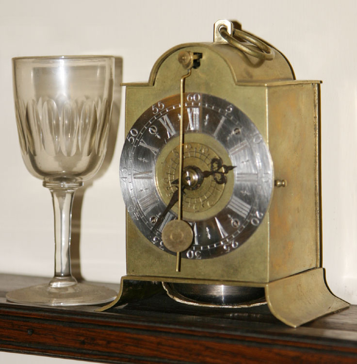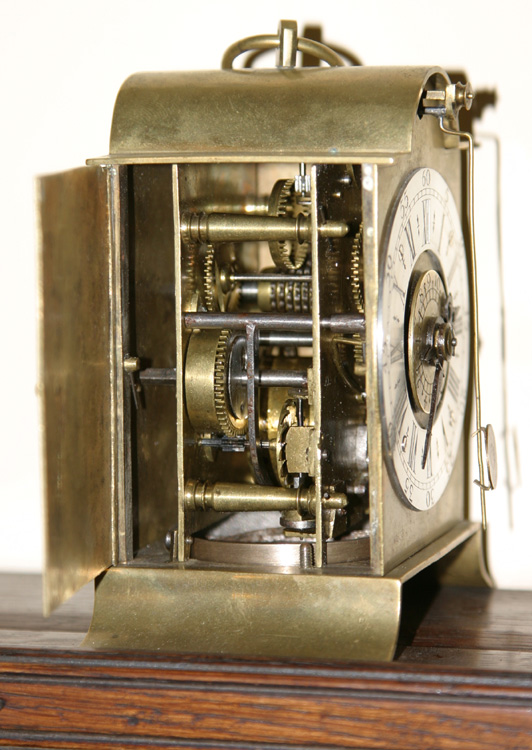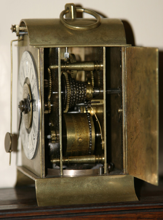 The brass case containing a small, plated, chain fusee-powered going train with crown wheel verge escapement. Spring-driven alarm striking on an underslung bell. Applied pewter chapter ring engraved with Roman numerals and Arabic 5 minutes. Brass engraved alarm disc and steel hands. Complete with brass key.