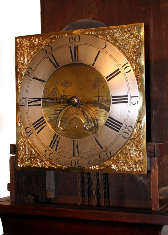 A George III mahogany longcase with 11" square brass dial and 30-hour birdcage movement. The solid mahogany case standing 79" high, the hood with period glass. The case is solid and a dark mahogany with a good patina and some very fine mouldings. Turned hood columns with plain brass capitals attached to the door. The dial has steel hands and fine engraving of a country scene to the centre with calendar below. Original chain drive, old weight and period pendulum.