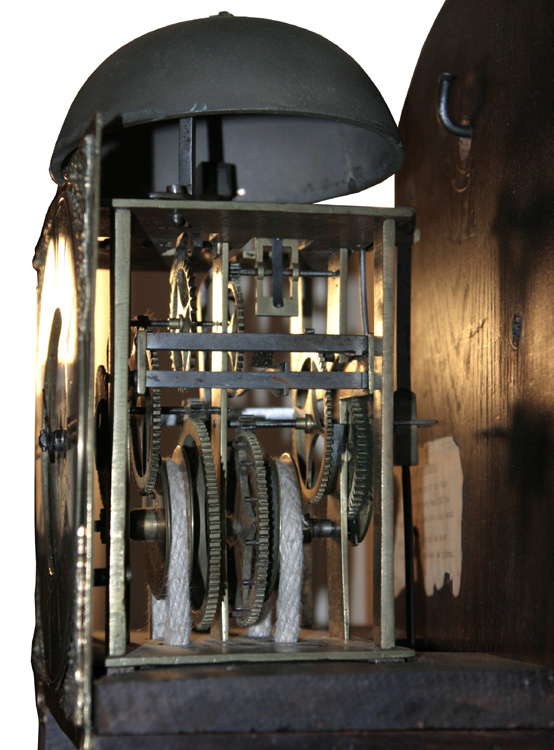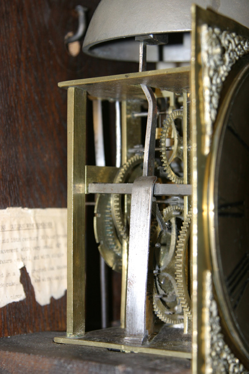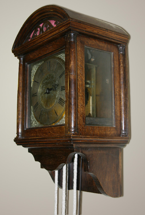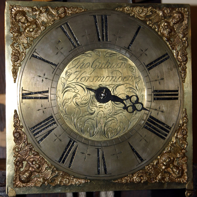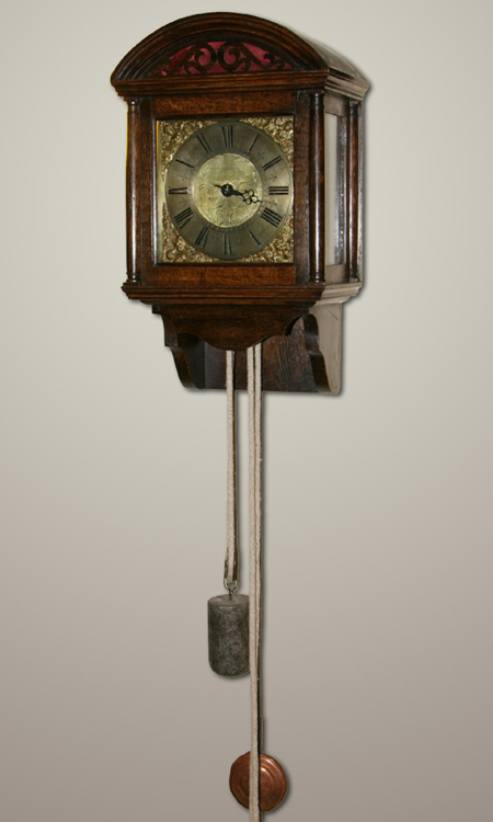 A hooded wall clock circa 1720 with 8 inch square brass dial signed "Thos. Guluan Horsmonden" to the foliate-scroll engraved centre within an applied silvered Roman numeral chapter ring with cruciform half-hour markers and mask and scroll cast spandrels to angles. The 30-hour posted countwheel bell-striking movement with anchor escapement. Interesting copper-faced pendulum bob.