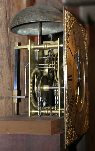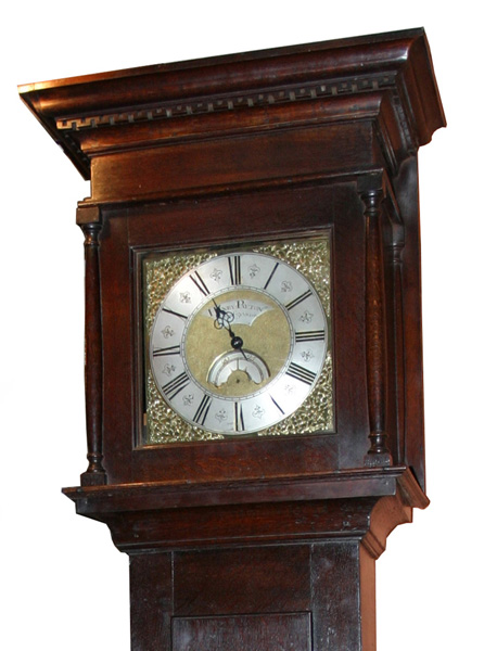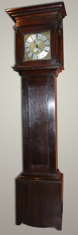 A George II oak longcase with 10" square brass dial and 30-hour plated movement.