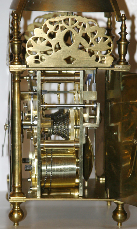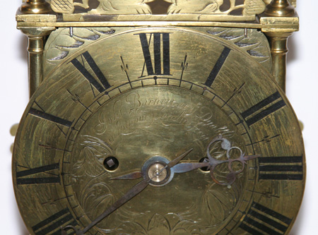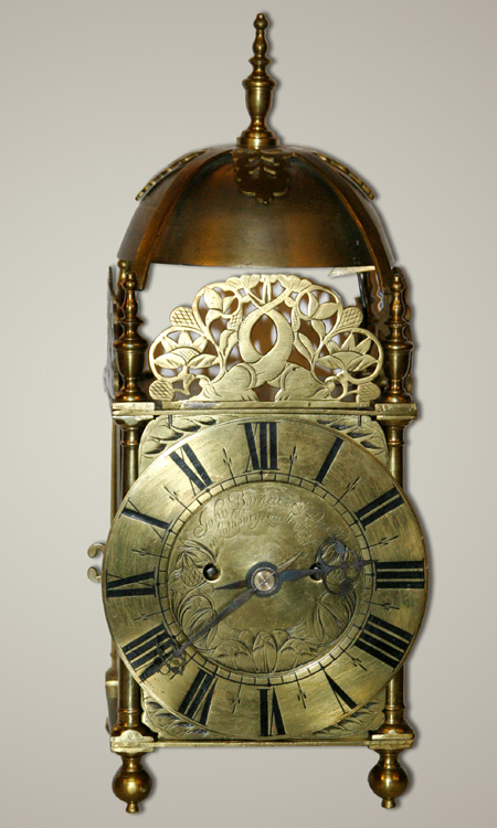 The frame of this clock is of standard lantern proportions. The front fret engraved with crossed dolphins. The chapter ring with Roman numerals and inner quarter hour track with wheatear half hour markers enclosing the centre. The finely engraved dial plate with tulip design and carrying the maker's signature "John Barnett at ye Diall in Lothbury Londini fecit".