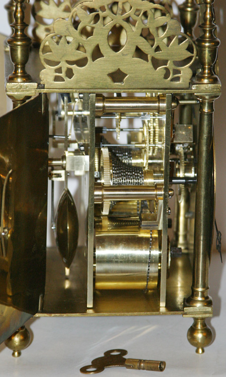 The clock keeps excellent time, counting the hours by striking on the original lantern clock bell and with passing strike on the half-hours. The movement has just undergone a total overhaul to a very high standard including servicing of pinions and bushes where required. The movement has been fully cleaned and polished as can be seen in the photographs. The pendulum and movement are totally contained within the frame of the clock and the pendulum also has its original transit screw.