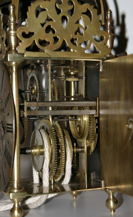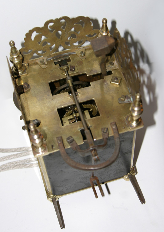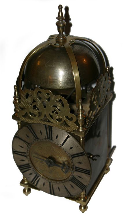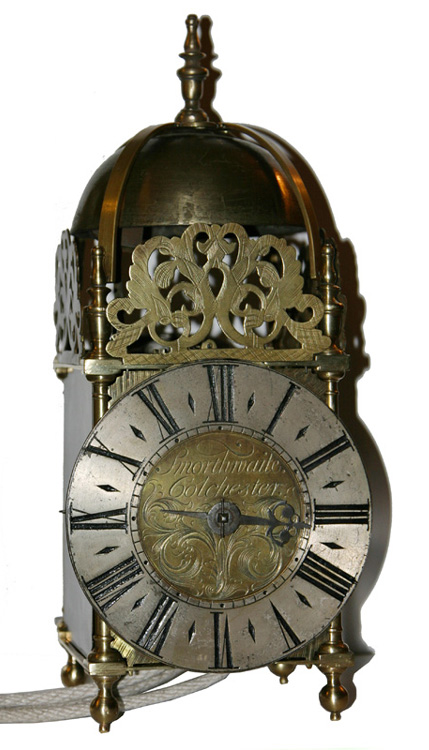A fine example of an early 18th century lantern clock made by John Smorthwaite of Colchester. Thirty-hour weight-driven movement running on its original recoil (anchor) escapement and counting the hours on the lantern bell. The clock retains its original frets, the side fret showing evidence of an early repair. The doors are of heavy, cast and scraped brass showing some great age and may be original to the clock (doors are often lost due to their nature, lifting out very easily). There are no spurious holes to the clock frame which indicates it has not been tampered with or suffered any conversions. The silvered chapter ring having Roman numerals with lozenge half-hour markers. The deeply engraved dial plate being very typical of Smorthwaite clocks. The iron hand would appear to be original.