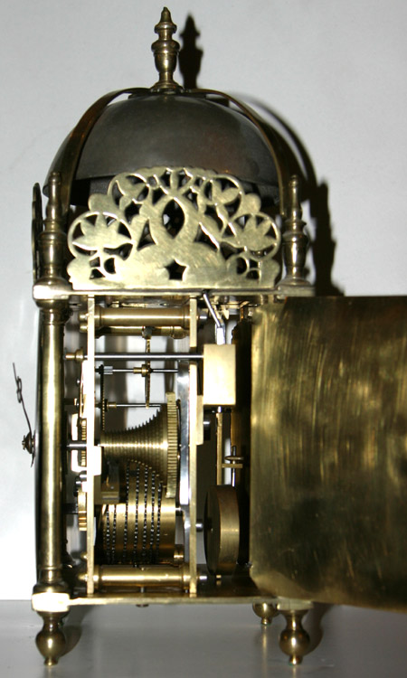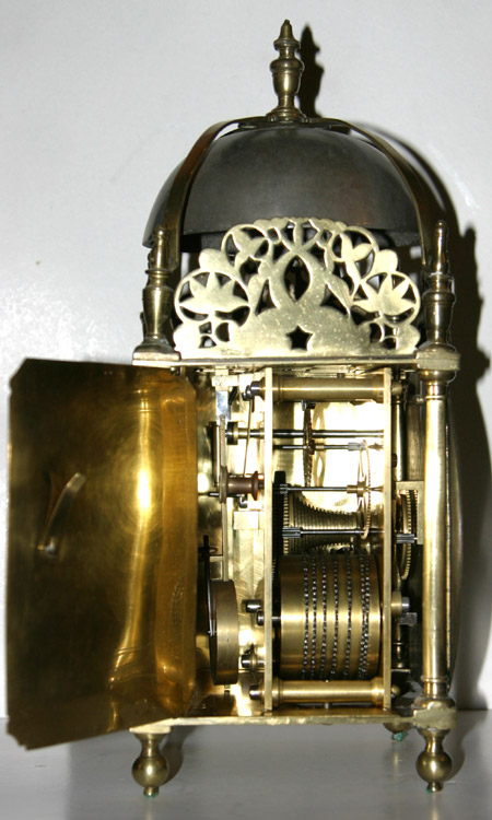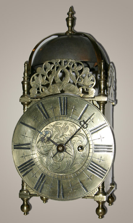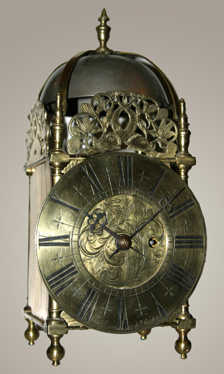 An early eighteenth century english lantern clock by the Colchester maker John Smorthwaite with later single-fusee movement. The high-quality 8-day single-fusee movement with passing strike makes the clock freestanding and free from chains or rope.
