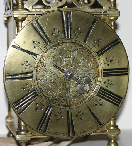 A fine example of an early 18th century lantern clock made by John Smorthwaite of Colchester. Thirty-hour weight-driven movement running on its original recoil escapement and counting the hours on the lantern bell. The clock retains its original frets, the doors are of heavy, cast and scraped brass showing some great age and may be original to the clock. Iron backplate, original hoop and spikes. The chapter ring having Roman numerals, the deeply engraved dial plate being very typical of Smorthwaite clocks.
