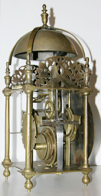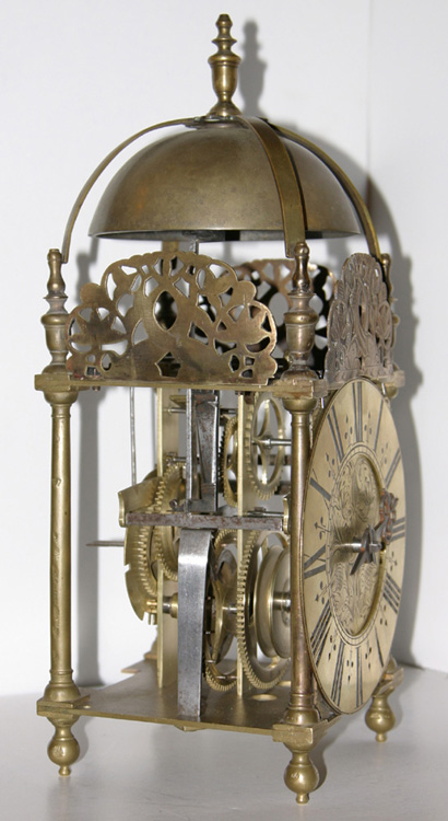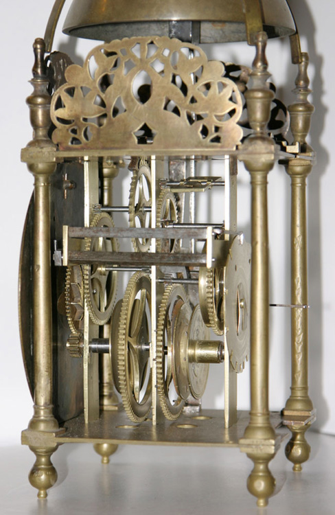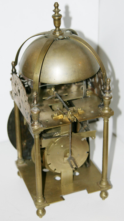 A countwheel striking lantern clock with original recoil escapement and long pendulum. Very original movement running on original rope driven pulleys.