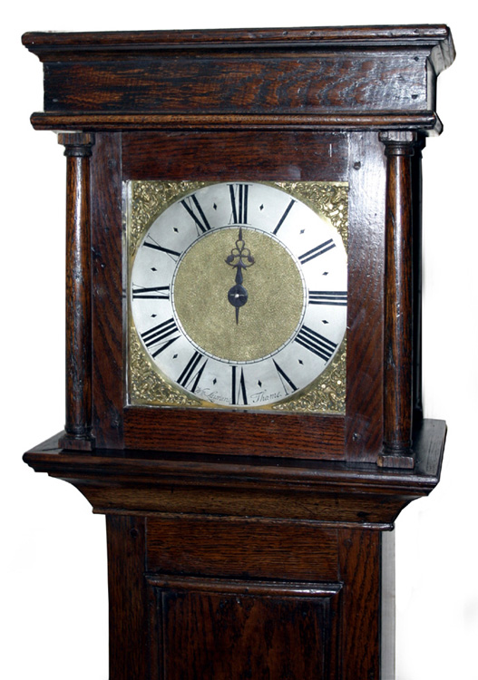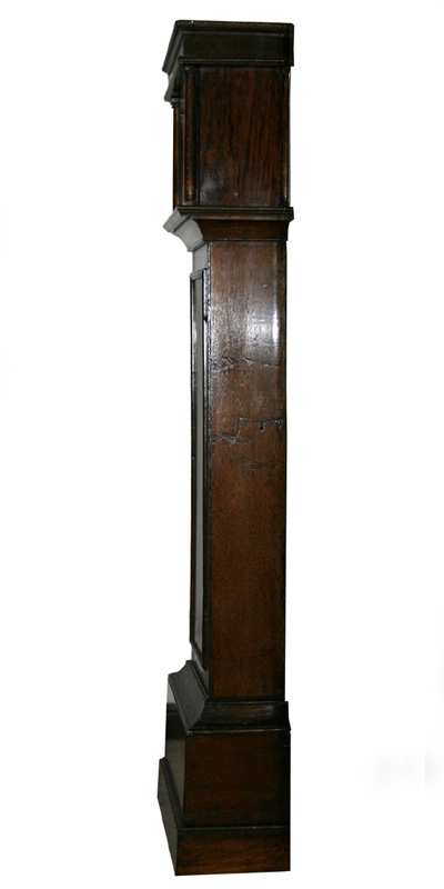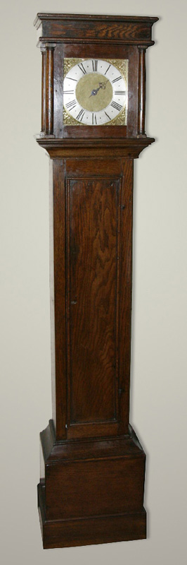An extremely rare George II miniature oak longcase with 8" square brass dial and 30-hour birdcage movement. Fine matting to dial centre, silvered chapter ring and fine steel replacement hand. The oak case stands 66" high with opening front door with fixed decorative pillars and with quarter pillars to the rear of the hood. The case is solid and has been sympathetically restored.