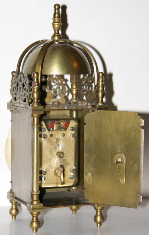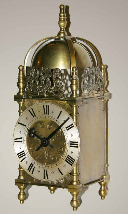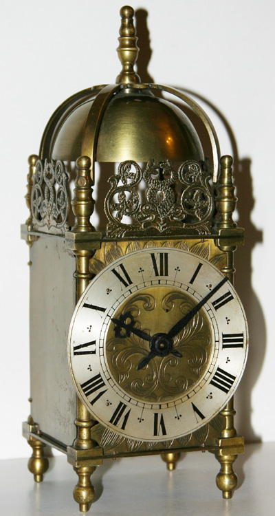 A 17th Century style reproduction lantern timepiece by Davall. Spring-driven movement contained within a gilt metal case. Stands 10" high.