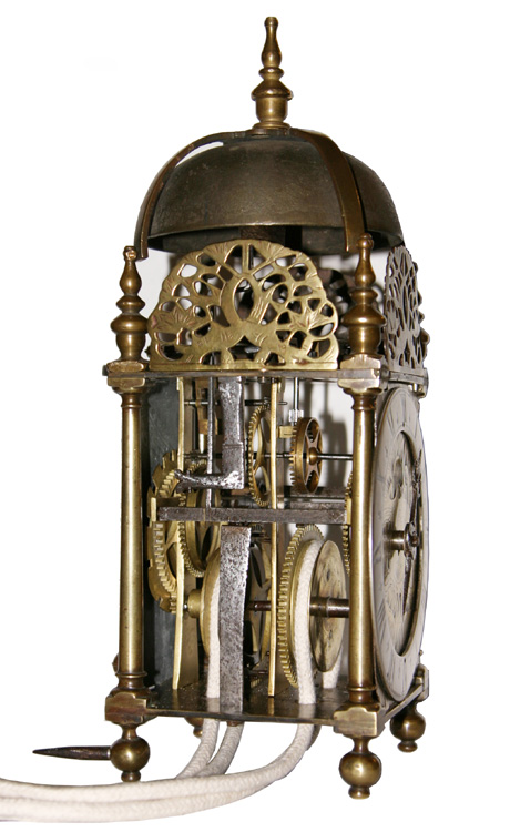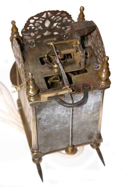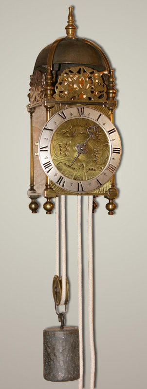 A striking timepiece with no evidence of an alarm ever having been fitted. Having crown wheel and short bob pendulum. The hammer stop in the usual style of Northern lantern clocks. Rope drive on the Huygens continuous rope system. Engraved dial centre. Original iron hour hand. Cross-dolphin frets.