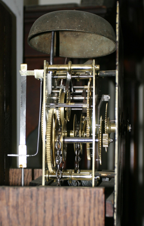 The oak case stands 77.5" high and is therefore ideally suited to a country cottage. The hood having attached turned columns with wooden capitals to the front. Nice long 34" door.
