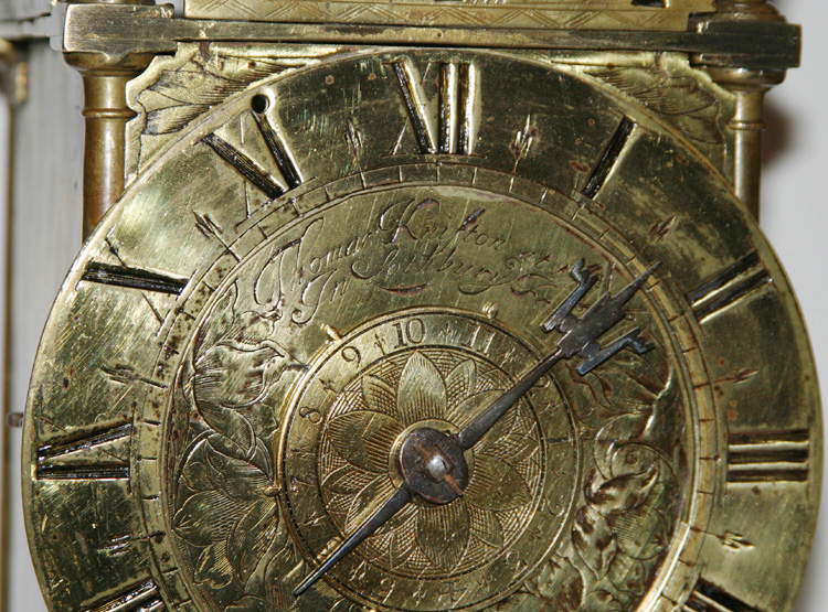 The dial plate with early Lothbury tulip engraving and carrying the maker's signature 'Thomas Knifton at the Cross Keys Lothbury'. Single iron trident-shaped hand.