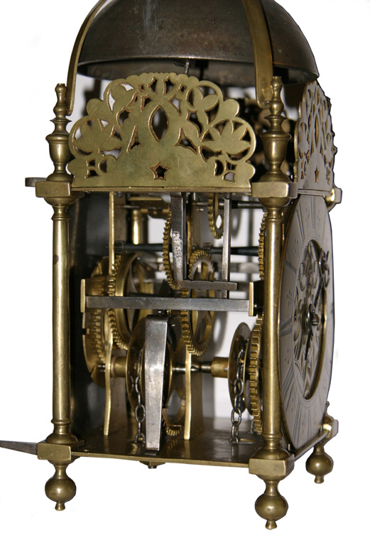 A striking timepiece with hoop and spikes. The clock running on its original tic-tac escapement. Tic-tac escapements are rare but, when found, are usually on West Country lantern clocks. The lantern frame having single-piece pillars and a broad frame, probably a Bristol casting. West Country clockmakers often sourced their castings from Bristol. Chain drive on the Huygens continuous system. The engraved dial decorated with a large scale tulip pattern. Coarse wheels, heavily tapered arbors and large pinions.