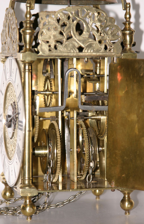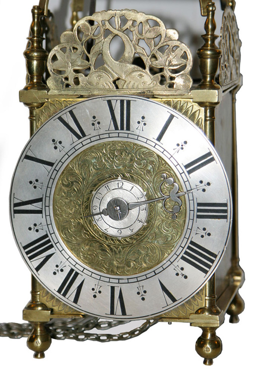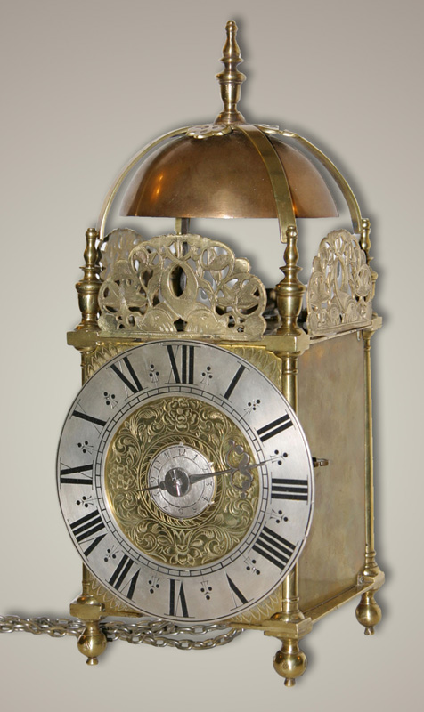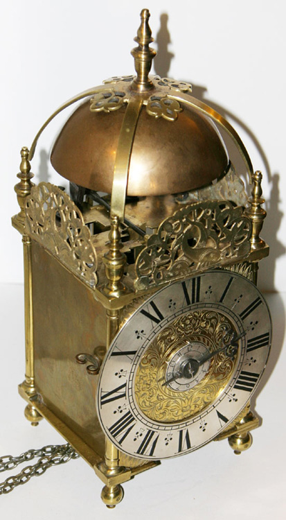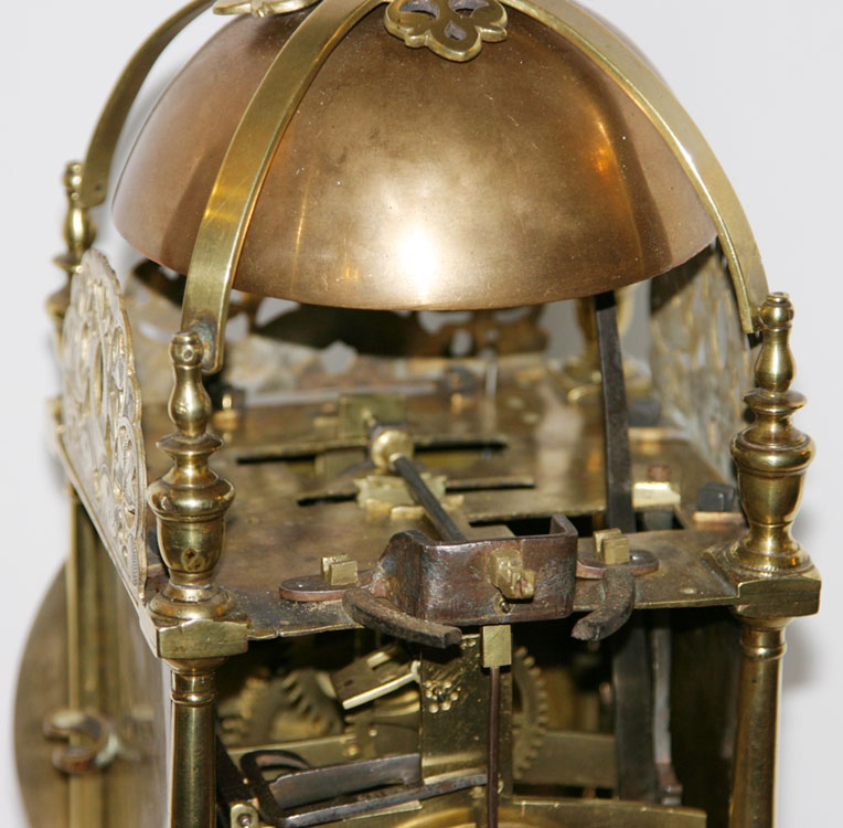 Lantern clock with centre-swing movement, originally with hoop and spikes (now lacking, except for remnant of hoop).