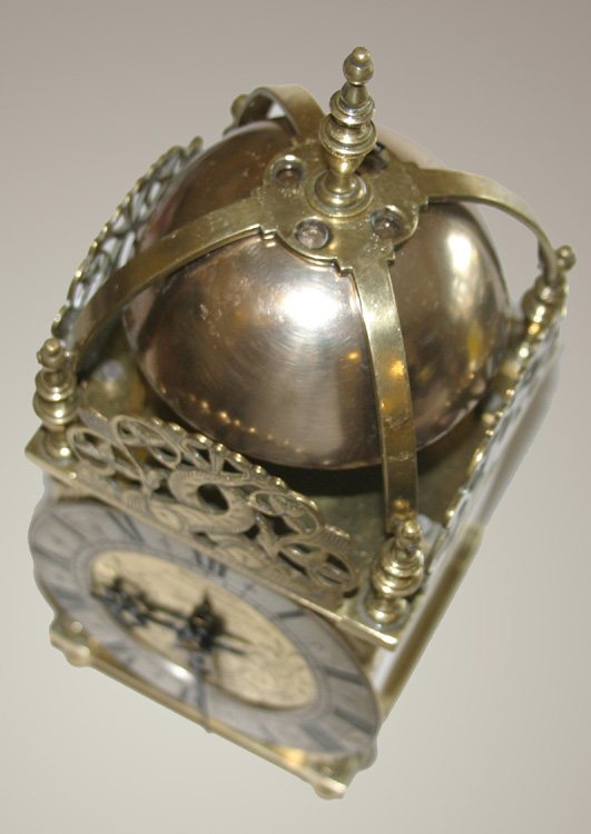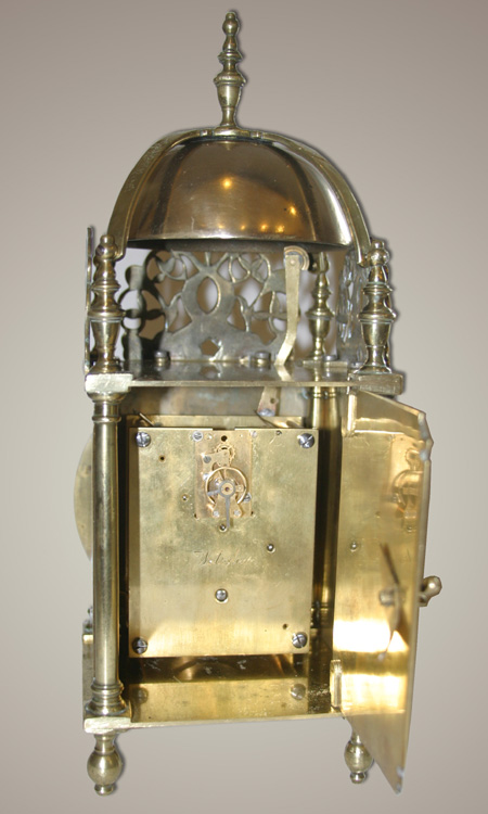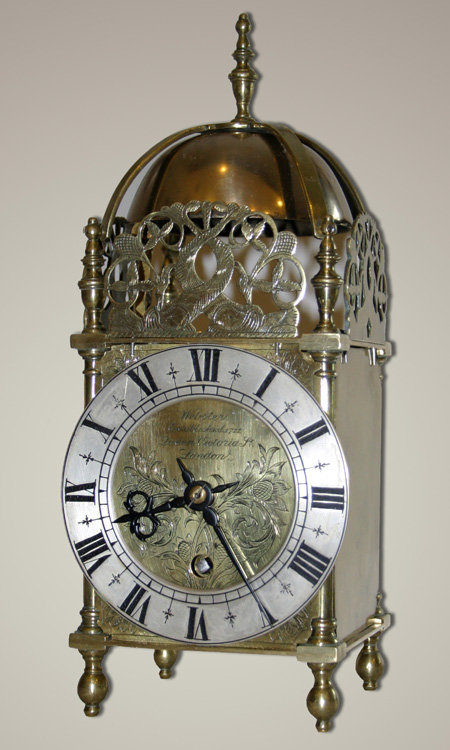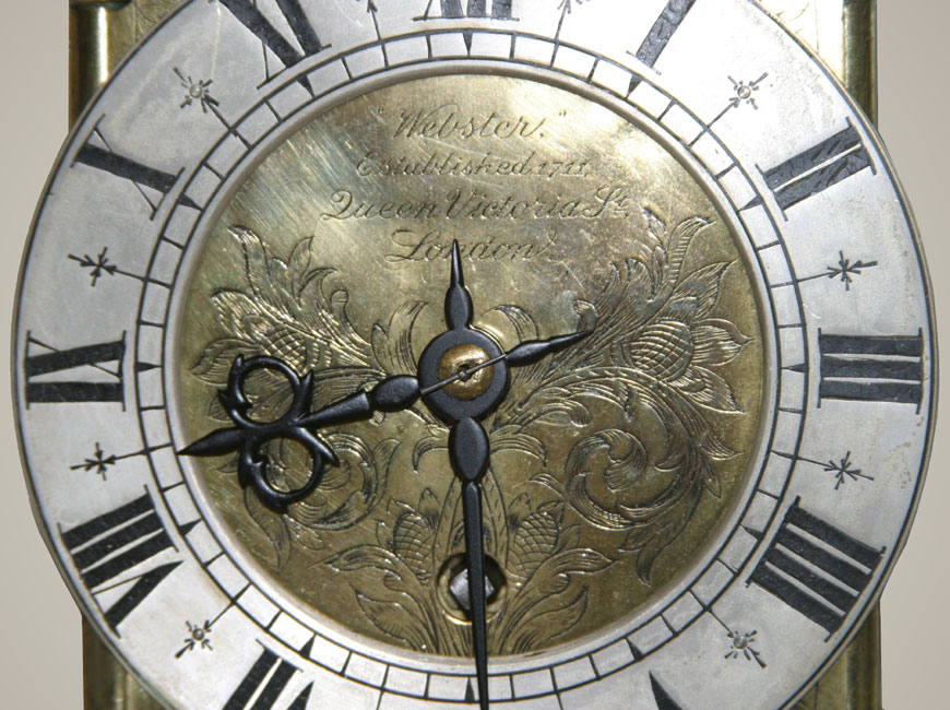 A spring-driven lantern clock by Webster of Queen Victoria Street, London. The dial engraved 'Webster, established 1711, Queen Victoria Street, London' and with foliate decoration below. The silvered chapter ring with Roman numerals. Traditional cross-dolphin frets. The 8-day spring-driven movement with passing strike and the maker's name 'Webster' engraved to the back plate. Overall height of the clock 11 1/2 inches and width 4 1/2 inches.