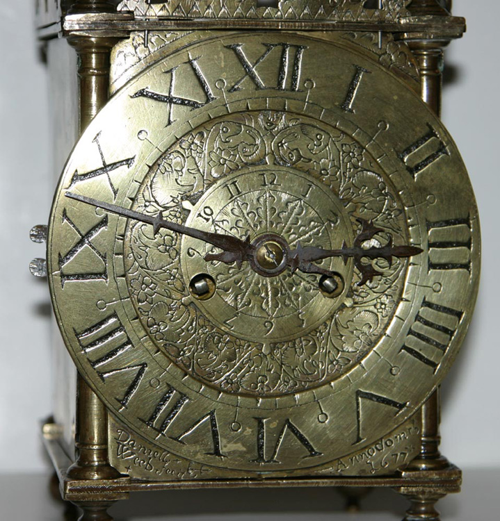 The engraving is in the style of a second period lantern clock although the dial plate is signed by the maker and dated "annodom 1677".