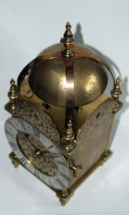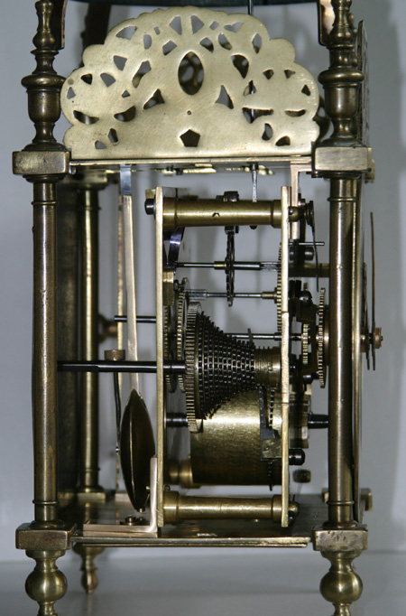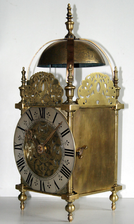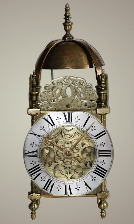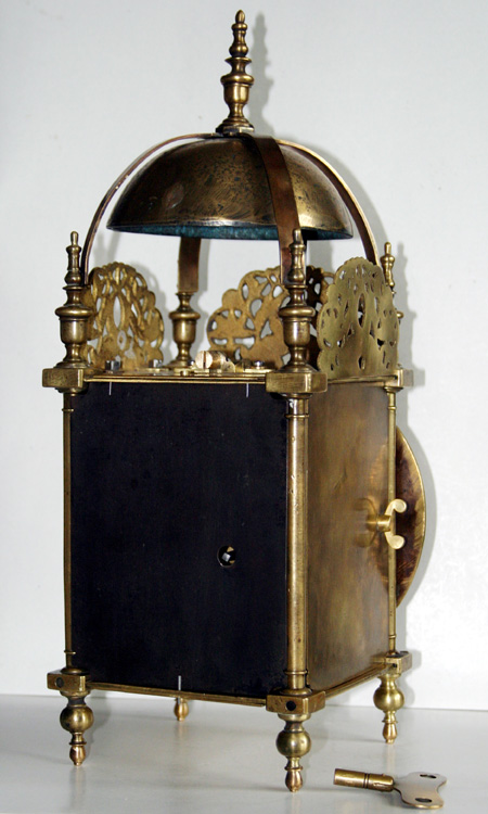 A fourth quarter 17th century West Country lantern clock with later rear-wind fusee movement. The high-quality, single fusee movement makes the clock freestanding and free from chains or rope. The main advantages over the traditional weight-driven movement are that the clock can be sited on a mantle or table-top and there is no need to wind the clock daily. The clock keeps excellent time, striking the hour with a single passing strike on the lantern bell.