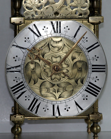 The broad lantern frame having single-piece cast brass pillars of typical West Country style. The engraved dial decorated with a large scale tulip pattern, typical of Bristol makers. Nicely engraved crossed dolphin front fret and plain side frets. The Roman numeral chapter ring with trident half-hour markers and inner quarter hour track. The chapter ring was trimmed top and bottom by the clockmaker to fit between the plates, which is also commonly found in West Country clocks. Note the numerals 'VI' and 'XII' have been engraved at a reduced height to fit into the available space on the chapter ring (see detail photograph).