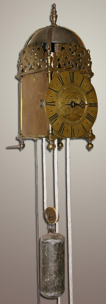 An early- to mid-18th century lantern clock by William Hawkins, running on its original recoil escapement and Royal pendulum. A rare and original clock, unravaged by the passage of time. The clock has had very little use - the original wheelwork shows little sign of wear, the strike side running exceptionally smoothly.