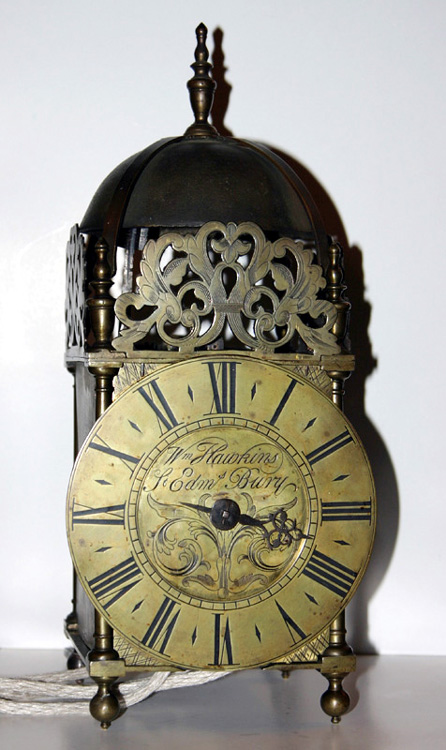 The chapter ring with engraved Roman numerals and lozenge half-hour markers. The dial plate having fine foliate engraving and carrying the signature "Wm. Hawkins, St Edm Bury". Some interesting 'practice' engraving can be seen to the rear of the dial plate and chapter ring. Fine original pierced iron hand. Hoop and spikes, with spikes attached to the ball feet. The two train, weight-driven movement with countwheel strike and anchor escapement. This clock has a pleasant patina.