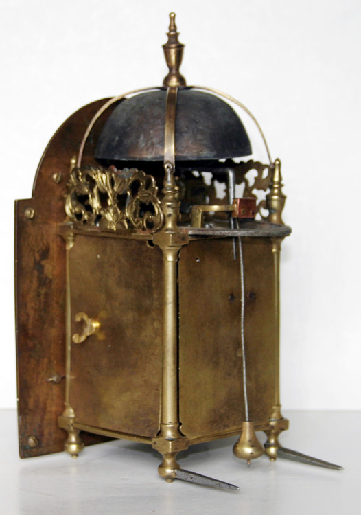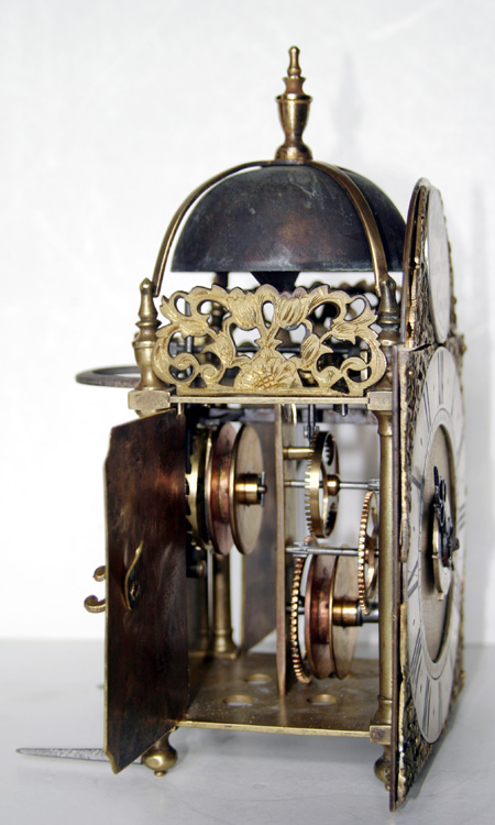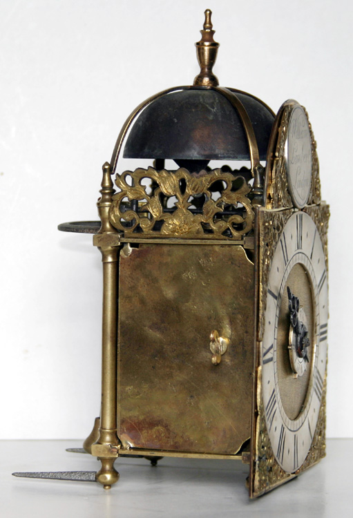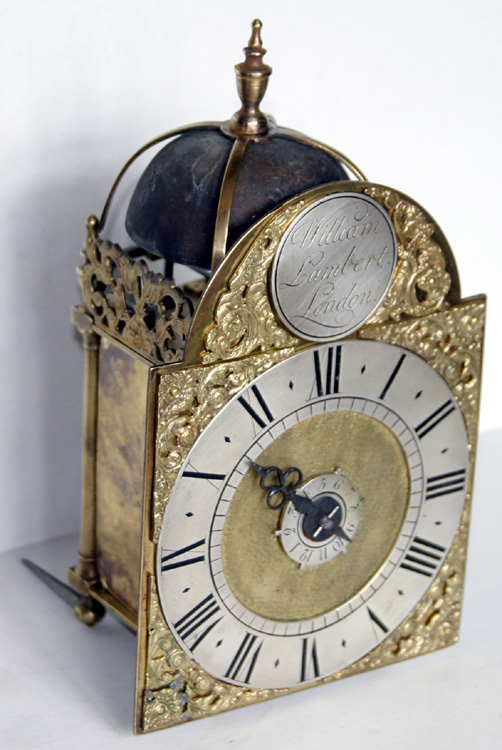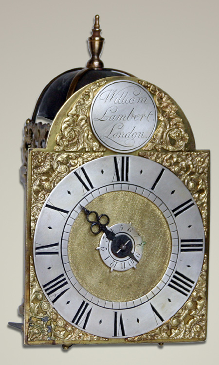 The break-arch dial with finely-matted centre, applied silvered chapter ring engraved with Roman numerals and lozenge half-hour markers, silvered alarm setting disc with Arabic numerals to dial centre. Original, finely detailed, pierced iron hand. Silvered boss in break-arch carrying maker's signature "William Lambert, London".